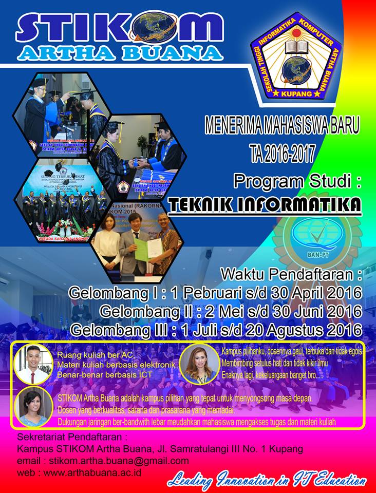 Telah dibuka penerimaan mahasiswa baru STIKOM Artha Buana. Waktu pendaftaran dimulai 01 Februari 2016 s/d 20 Agustus 2016. kami membuka peluang bagi anda untuk bergabung dengan kami untuk berkarya didalam bidang Informatika tanpa adanya pengujian tes masuk. Informasi lebih lanjut hubungi sekretariat Pendaftaran STIKOM Artha Buana Kupang Jalan Sam Ratulangi III No.1.